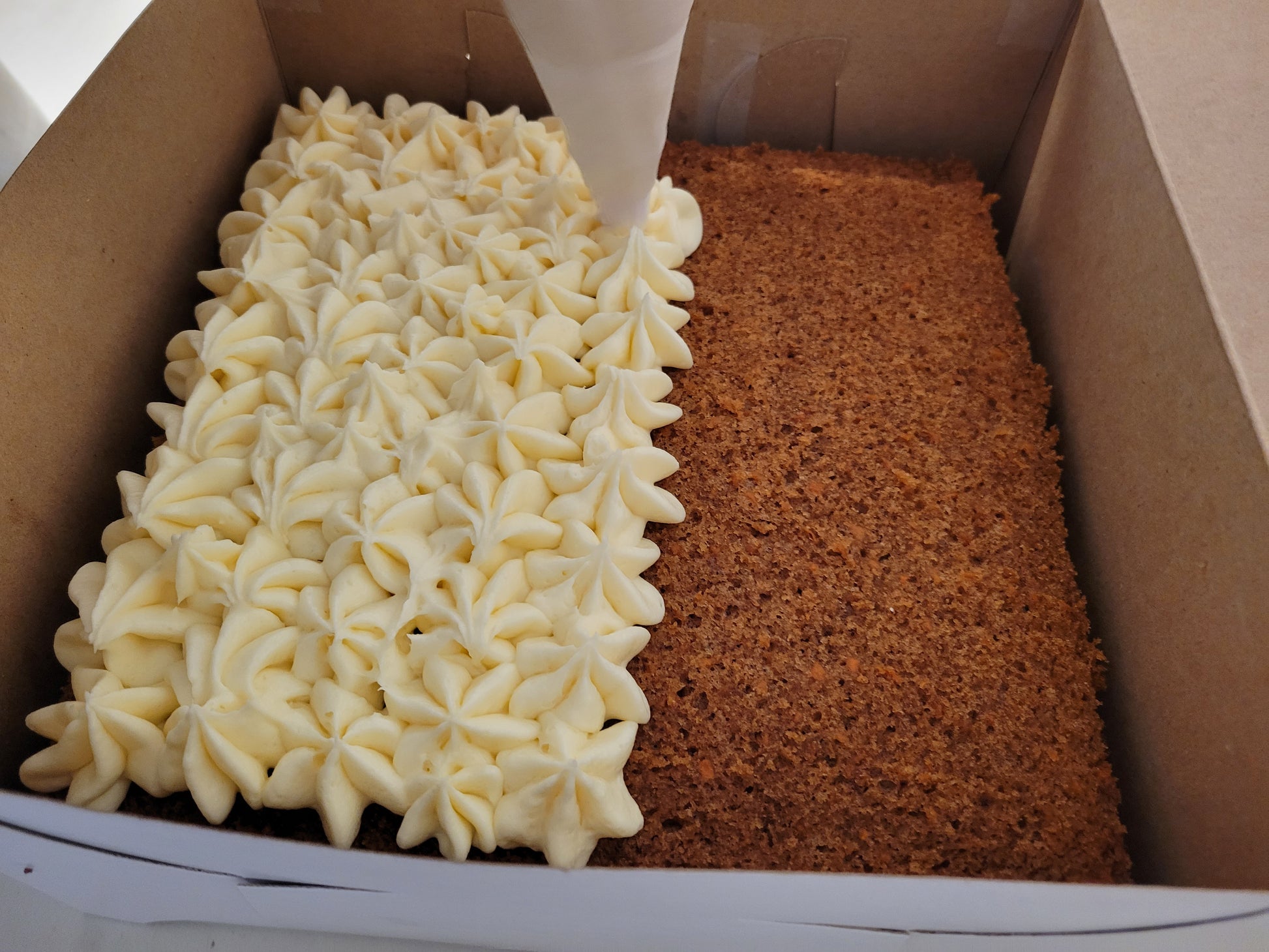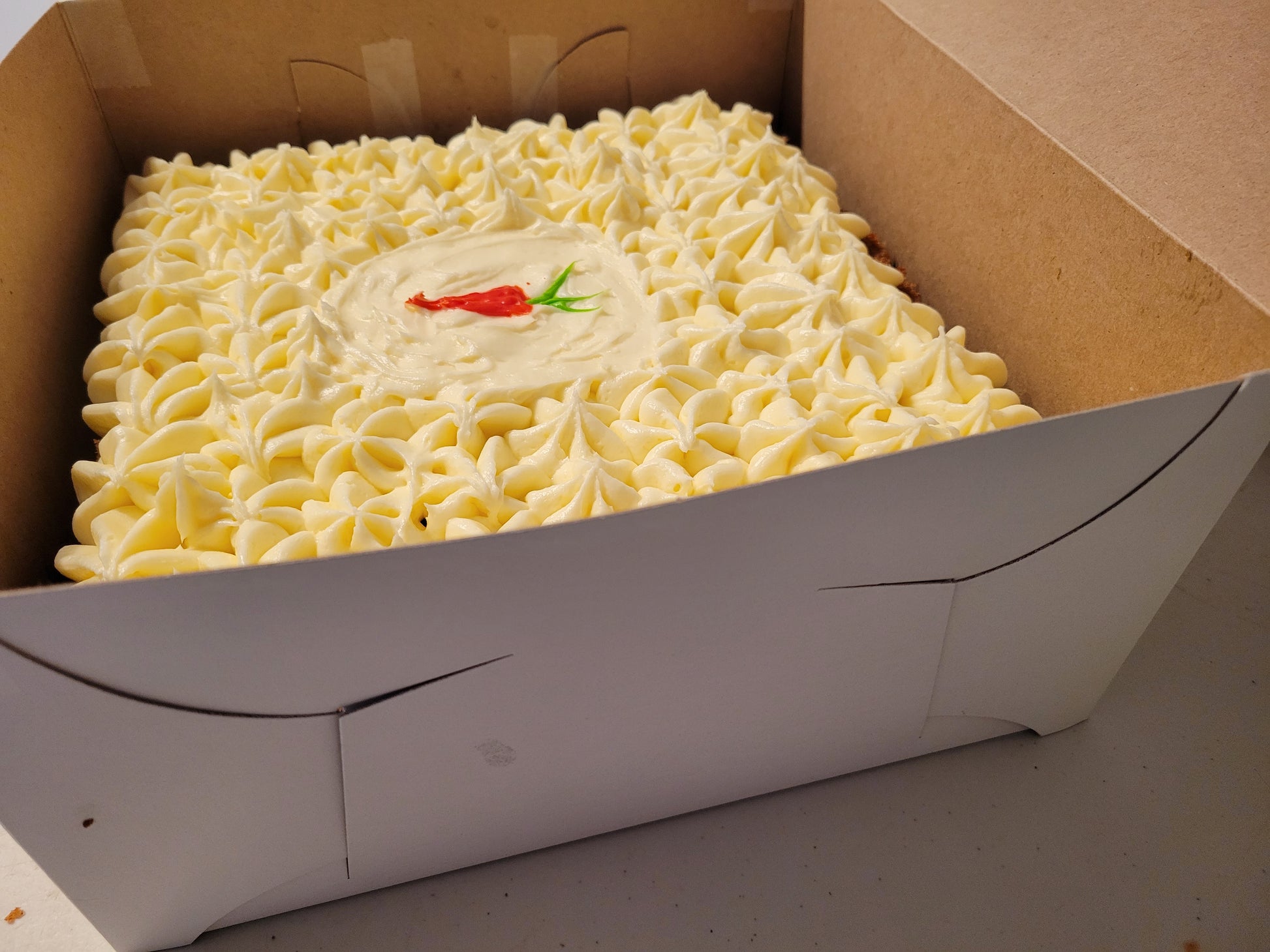 This 10 x 10 inch three layer cake is perfect for any special occasion. Serves 10+, made with real cream cheese frosting.